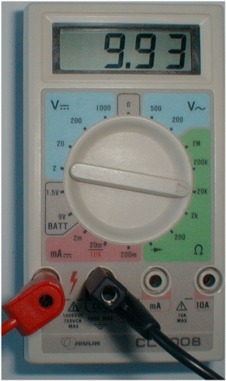 Actuellement, rien n’étant connecté aux deux bornes de l’ohmmètre, on mesure la résistance de l’air entre ces deux bornes. Cette résistance est supérieure à 2 MΩ. L’ohmmètre ne peut pas donner le résultat de cette mesure, il affiche 1. à gauche de l’écran.