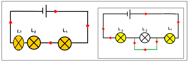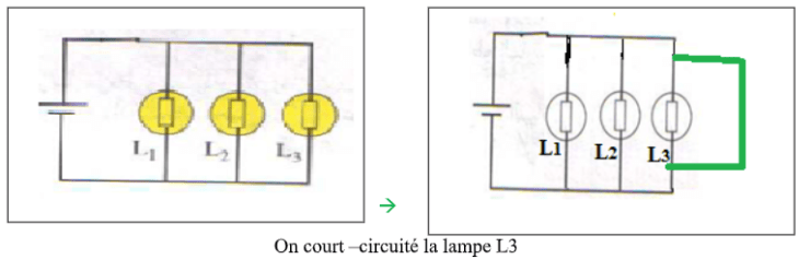 Lorsqu’un fil est ajouté entre les bornes de L 2 , celle –ci s’éteint et l’éclat de L 1 et L3 devient plus fort.