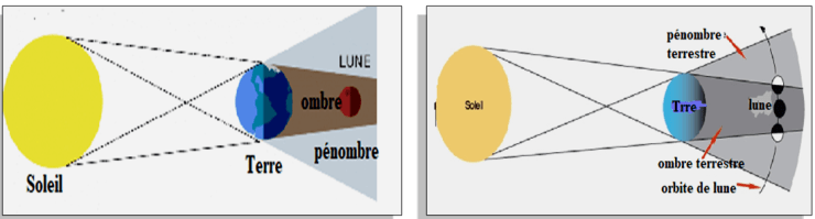 · lors d’une éclipse de lune, la terre et la lune et le soleil seront alignés;et une éclipse se produisant à chaque fois que la Lune se trouve dans l’ombre de la Terre.