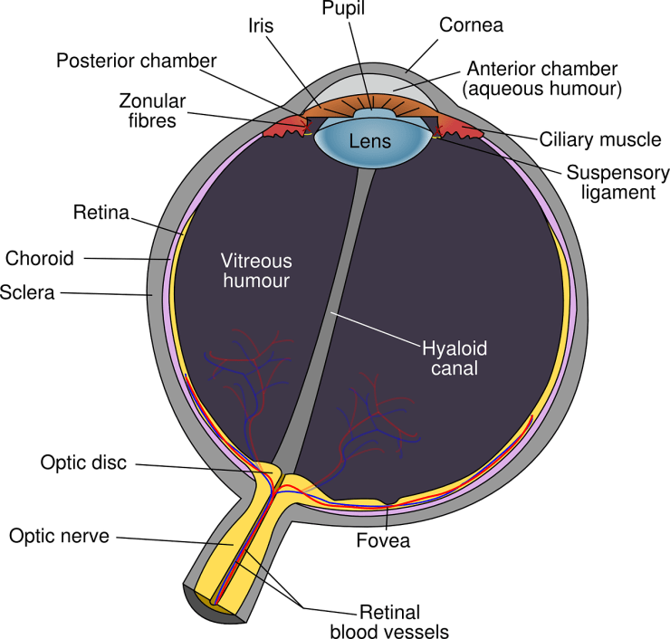 Les rayons de lumière issus de l’objet pénètrent dans l’œil et traversent la cornée et l’humeur aqueuse. Ils traversent ensuite la pupille, qui fonctionne comme un diaphragme et qui en se fermant permet de diminuer la quantité de lumière reçue par la rétine (ce qui évite l’éblouissement). La pupille dont le diamètre varie donc en fonction de la luminosité est entourée d’un iris coloré (qui est responsable de la couleur des yeux).