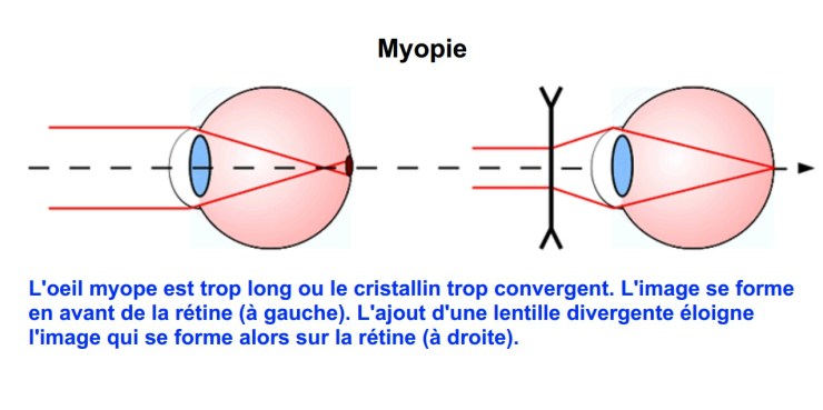 Pour corriger ce défaut, il faut donc diminuer la vergence de l’oeil en plaçant devant une lentille divergente.