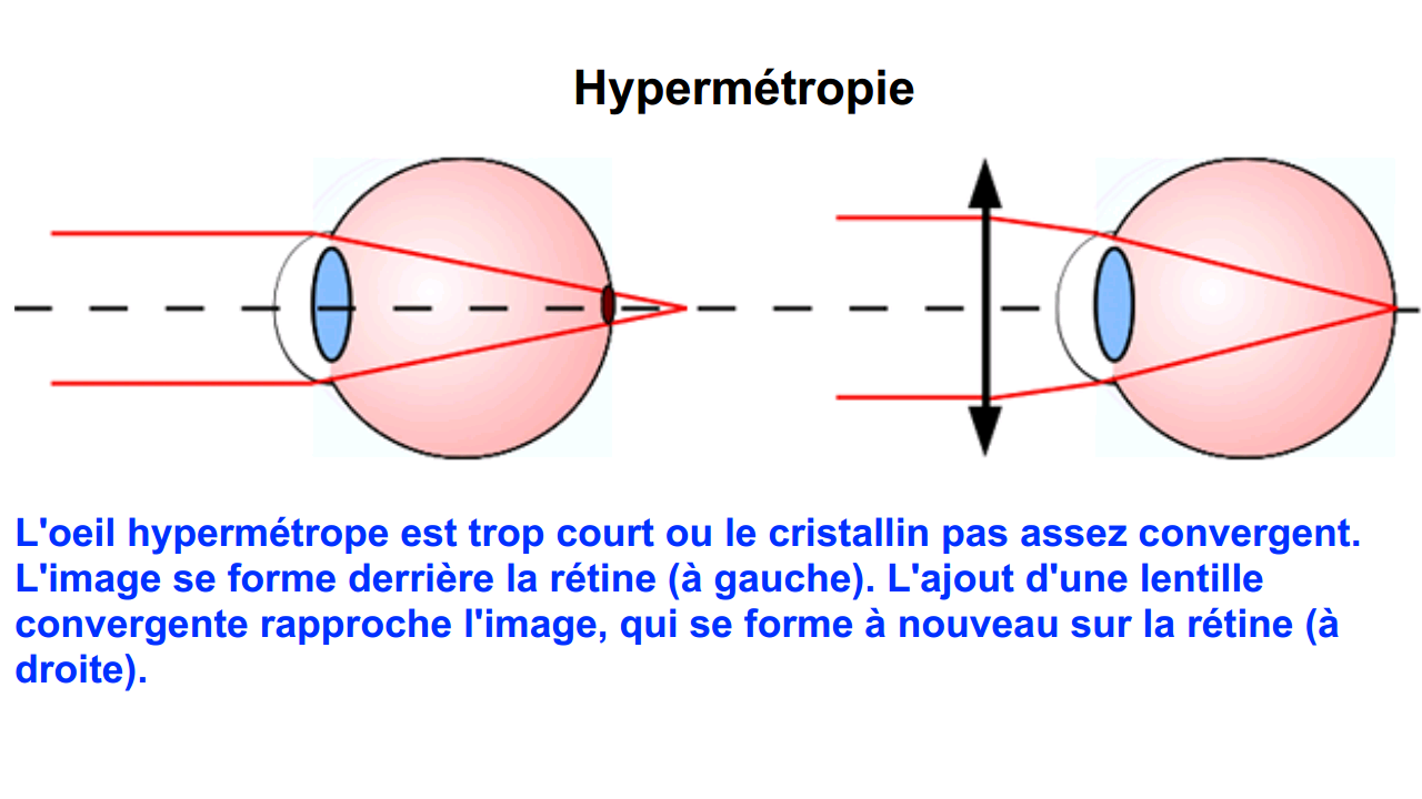 À l’inverse, un oeil hypermétrope est trop court ou le cristallin n’est pas assez convergent. L’image d’un objet à l’infini se forme en arrière de la rétine. L’oeil doit constamment accommoder pour ramener l’image au niveau de la rétine, ce qui provoque une fatigue.