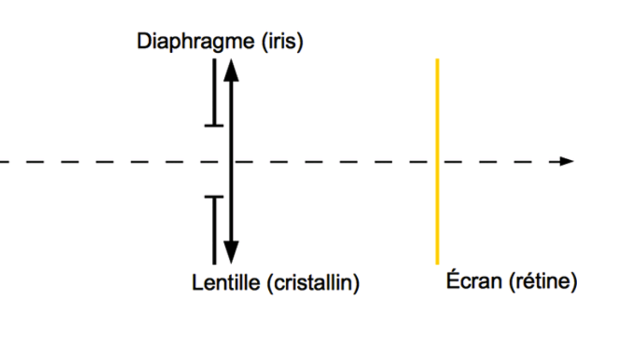 On peut modéliser l’œil par un ensemble constitué d’une lentille convergente, d’un diaphragme et d’un écran.
